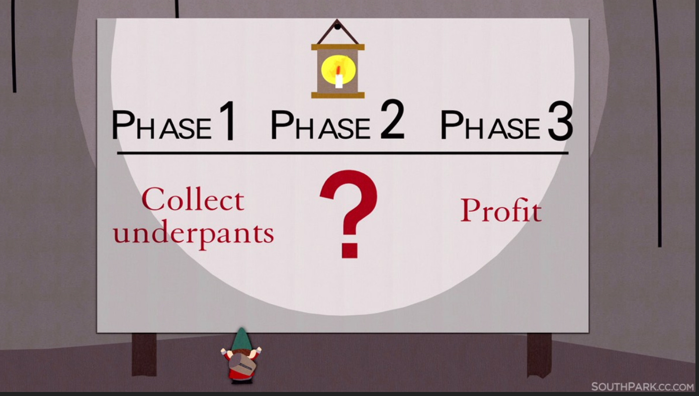 More to the point: what does Harold Hill get out of this? A small profit margin on the instruments and uniforms? That doesn’t sound like a con to me; it just sounds like capitalism. (Okay, okay, I walked right into that one.) It’s just like the “South Park” episode featuring the underpants gnomes who think they can turn their kleptomania into some kind of world domination: